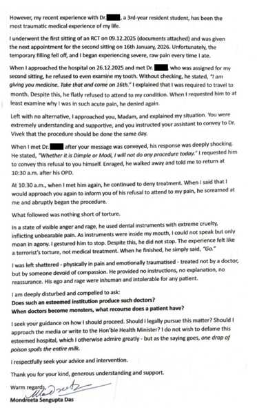A few days later, I returned to narrate the incident to the dean. The same dean who had once been warm and gracious, especially when she learned of my media connection and requested me to write about her after she won the title of Mrs India, now refused to meet me once she knew I had come with a complaint. Another senior doctor heard my account but initially defended both the concerned doctor and the institution strongly. When I expressed my fear that a doctor who loses control in anger could endanger lives, he summoned the concerned doctor.