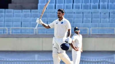 NEW DELHI: Jharkhand captain Ishan Kishan played a commanding innings to rescue his team from a precarious position, scoring a statement century as the visitors reached 307 for six against Tamil Nadu on day one of the Ranji Trophy season on Wednesday. Kishan, who has lost his place in the Indian side across formats, remained unbeaten on 125 off 183 balls, sharing a crucial unbroken partnership of 150 runs for the seventh wicket with Sahil Raj, who was batting on 64 at stumps.Jharkhand had been struggling and looked in danger of being bowled out for under 200, but the Kishan-Raj stand steadied the innings. For Tamil Nadu, left-arm pacer Gurjapneet Singh took the early wicket and finished with three scalps, while left-arm spinner DT Chandrasekar, making his Ranji return after a decade, chipped in with two wickets.At the Centre of Excellence in Bengaluru, defending champions Vidarbha put up a solid total against Nagaland, closing day one at 302 for three. Opener Aman Mokhade anchored the innings with an unbeaten 148, while Dhruv Shorey made 64, and Yash Rathod was unbeaten on 66.In Kanpur, Andhra got off to a strong start against Uttar Pradesh, with opener and wicket-keeper batter KS Bharat scoring a patient 144 off 244 balls, including 13 fours. Number three Shaik Rasheed complemented Bharat with an unbeaten 94, giving Andhra a strong platform at stumps.