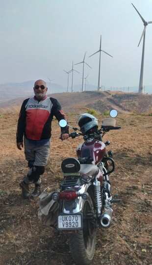 YG, perched atop his Himalayan 411 with its 21-inch front wheel and dual-purpose tyres, began his ascent like an enduro pro—standing on the pegs and kicking up rubble. I followed with significantly less grace and great trepidation. My street tyres were never meant for this rutted, stone-strewn track. I spent the next 3km in a state of high-intensity “anxiety management,” grinding along in 1st gear and praying my rear tyre wouldn’t decide to take a nap in the dirt. Thanks to a mix of extreme caution and residual muscle memory, I made it to the base of a giant windmill without any unplanned dismounts.