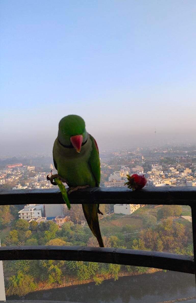 April 2021, I had a visitor from the open sky—a Parrot. I was overwhelmed to see the ‘green delight’.